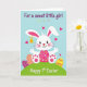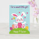 This card shows a white long-eared bunny 🐰 centered on a rolling green hill, with pink inner ears, shiny black eyes, and rosy cheeks that make its smile look gently affectionate. The bunny wears a pink dress with small dots, and its forward gaze feels like a friendly hello meant for someone close. Around the hill sit several decorated egg shapes in yellow, pink, and purple, each finished with zigzags and dotted patterns that add a festive touch. Near the bunny’s left ear, a small golden bell floats like a tiny charm, adding a sweet accent without crowding the scene. The background is sky blue with scattered confetti-like dots and fuchsia hearts that drift upward, suggesting a tender, shared moment 🌷. Curved lettering in a dark ink tone sits near the top and along the sides, framing the picture with a short message, while smaller text appears nearer the bottom in a matching color. The hearts are bright fuchsia and spaced across the upper half of the blue background.