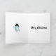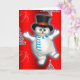 Ett sött julkort från snögubbe med ett vackert snögubbe, klädt i ett glansigt svart top hat och med en blå och vit stripe-halsduk. Han dansar i snö med Julgranar runt honom, allt på en färgstark röd bakgrund. Detta mycket festliga kort kommer att bli en stor slå med vem som helst som har turen att få det.
