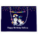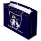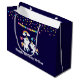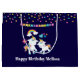 Grattis på födelsedagen-presentväska med 2 söta dansunicorns med ljust och färglöst svan, och mane. En färgstark regnbåge med moln på varje sida ovanför huvudet. I andra inslag finns en liten blomma ett hjärta och några stjärnor. Mörkens lila - bakgrund. Färgfulla konfektpunkter och en buntbanderoll längs överkanten.