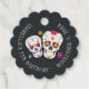 Tack till gästerna i party med dessa förtjusande märkre som är perfekt för att de sätter sig i party favors eller godis påsar. Day of the dead har en mjuk svart bakgrund med två invecklade döskallar av socker som är dekorerade med färgade blommor. Anpassa med anpassningsbarnas meddelande med vit text. Designad för att matcha vår Dia de los Muertos-födelsedagssamling.