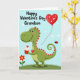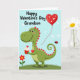 This greeting card shows a cute emerald-green cartoon dinosaur standing on a simple strip of grass. The dinosaur has big shiny eyes, a wide smile, and a little rosy blush on its cheeks, with red spikes running down its back. In one hand, it holds out a cupcake in a red wrapper, topped with white frosting and a tiny red heart, like a small treat offered with love ❤️. Near the top of the card, the words “Happy Valentine’s Day Grandson” appear in a fun, flowing letter style in dark ink, set across the upper area. Beside the message, a red heart-shaped balloon floats upward with small white hearts on it, tied on with a thin red string. The background is a soft light-blue sky with faint white heart outlines, and there’s a tiny red ladybug near the dinosaur’s curled tail plus a red flower with a yellow center in front. It feels meaningful because the dinosaur’s friendly face and the offered cupcake make the love feel simple, sweet, and easy to give 🥰, perfect for sharing Valentine’s Day sentiments.