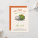 Adorable baby shower invitation with an illustration of a baby dinosaur or baby dragon about to hatch. Great for gender neutral baby showers since the colors are neutral green, orange and grey. Illustrated and designed by Patricia Alvarez.
