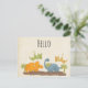 Ett vykort för hej med en söt design med 4 dinosaurier. Två flyger och två är på marken. Skapat med vattenfärger.