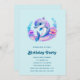 Födelsedag inbjudan med en bra illustration. En blå och lila delfin omgiven av söt blommigtar under vatten.