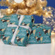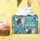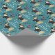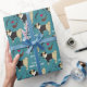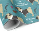 En vacker svart och tanklös pug bär en tuxedo jacka på den här söta födelsedagspressen papper. Förutom honom är bilder av mustasch, ett par ögonglasögon, ett rör och ett rött hjärta. Den vita texten säger: "Allt klädd för att önska dig en Grattis på födelsedagen". Bilder och texten placeras på gröntens baksida.