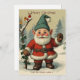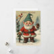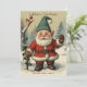En snygg charmerande dvärg tomten med rosenkinka och hopklappade i ett rött kostym och stod i ett snövintarrand. Bakom honom finns det Julgranar i snö som skapar en magisk helgdag.