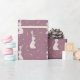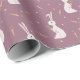Funny and cute wrapping paper with Easter white bunny and carrots pattern on muted purple background.