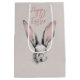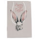 A rabbit sits in a close-up view with its large ears pointing up. The rabbit looks straight at the viewer with a neutral expression. The background is plain and simple.