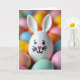 Designed with an intimate close-up focus, the front features a white, egg-shaped bunny figure with upright ears and a sweet, friendly face 🐰. Simple dark round eyes, fine black whiskers, and a heart-shaped pink nose give it a gentle look, like it’s leaning in for a quiet moment with someone close. Around the bunny, a cluster of colorful egg-like shapes gathers tightly, creating the feel of a shared springtime treat or a friendly circle. The background fades into a soft blur of pastel yellow, peach, mint green, and sky blue, keeping attention on the bunny’s face while the colors glow behind it 🌷. Soft, even lighting smooths the contours and adds a tender shine to the rounded surfaces. You can spot different textures in the mix, including glossy finishes, dotted patterns, and a fuzzy pink sphere that sits among the smoother shapes. Near the top, the greeting appears in light pink lettering, while the lower area is filled with softly out-of-focus eggs in yellow, peach, mint, and blue.