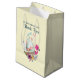 Gåspåse med en söt vattenfärgsmålning av en blek grönt ägg sitta inuti ett torkat basket. Dekorerad med rosett band, bröd, blommor och små hjärtan. En rosa flamingo och vit kanin vid sidan.