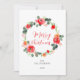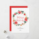 Elegant helgdag kort med en vattenfärgad krans av röda och korallblommor och eukalyptus löv, i ett runt ram, på vit bakgrund, delikat, romantiskt, botaniskt. Om du behöver någon annan matchande produkt eller anpassning kontaktar du mig.