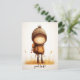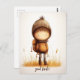 Ett vykort i bakgrunden med anpassadet "lycka till" med illustration av söt skolbarn.