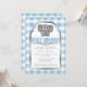 Blått och grått Baby Shower-inbjudningar med en välvillig, tillgiven baby-elefantillustration över ett blått och vitt gingham mönster. Detta är perfekten till när baby är en pojke eller när färg är blått i Mamma till be.