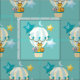 En för barn i mönster med söta djur, en lejon, giraff och elefant, som flyger genom natten himmel i en hett-ballon i luft med måne och stjärnor och en tealbakgrund.