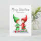 Cute god jul-platta kort med en illustration av ett elfpar i traditionell färg-grönt och rött. Anpassa all information, inklusive insidermeddelandet för att göra den verkligt unik. Illustrerad och designad av Patricia Alvarez.