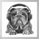 En lysande illustration av en hund med stora hörlurar. Den svarta och vita designen ger en liten nyhet.Den lekande och unika teckningen ger ett leende till någons ansikte och skapar den som en idealisk gåva till både hundälskare och musikentusiaster.