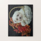 Den lilla vita marionetten med höst löv sitta i basket på svart bakgrund. © och ® Bigstock® - Med förbehåll för alla Höger.