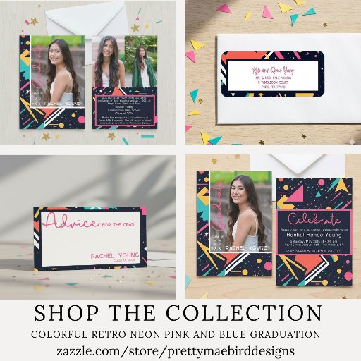 Gå in i 1980-talets pulserande värld med vår återinspirerade studenten-inbjudan, returadressetikett! Mot en bakgrund av djup marin blått, spricker rosa, elblått och limegrön abstrakt som påminner om tidsålderns ideotetik. Låt färg på 1980-talet väcka uppståndelse och nostalgi när vi komar tillsammans för att hedra en milstolpe värd att fira!