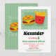 Barnets födelsedagsinbjudan innehåller en leende lycklig kawaii-hamburgare och fransk pommes på en söt grönt.