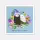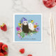 En chokladkaka och champagneillrar sitter tillsammans mellan färgade blommor i en blå bakgrund