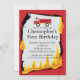 Starta din födelsedagsfest med eldbil från högerna med vår söta kallelse till brandbil som innehåller en röd eldbil med lågor på en röd prickbakgrund Cute för en första pojkars födelsedagsfest till din lilla brandman. Besök vår butik om du vill visa vårt stora urval av inbjudningar till barns födelsedag och matchande tackkort, klistermärken och frimärke. © Corazón Dulce