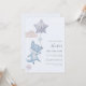 This first birthday party invitation features an adorable watercolor blue baby fox gently soaring through the sky in a lavender balloon, set against a soft, light blue background.