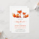 In the upper part, above the text, there are 2 cute red foxes, the bigger mama fox and the smaller baby fox pup, painted in watercolor. Under them there is the text: the words "baby shower" and are written in a red handwriting script, the name and the date / time in red caps, the rest in smaller black caps.
