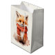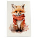 Gift bag with an illustration of a reddish orange fox pup. A subtle smile on his face. Wearing a nice red scarf for warmth.
