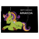 Fågelpresentpåse med en bild av en Frankenstein stil-encorn. Lila och grönt färg. Spooky söt.