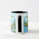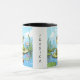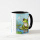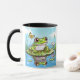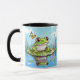 Personlig kaffe mugg. Den bedrövliga toad eller groda sitta på en liljespad omgiven av fjärilar med hans reflektion i vatten. Tecknad groda i tecknad bok stil.