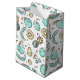 Gift-väska med en söt frukt mönster-linje teckning stil. Ljust grönt och gult färg. En sammanfattande roligt. En vit cirkel som läggs ovanpå med texten inuti.