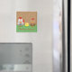 Färgfull kylmagnet levereras med söt tecknad av gult kyckling, brunt höna och vitt tupp och ett meddelande om bakgrunden till och anpassadet av trä. Det aktuella meddelandet lyder: "Chicken any?