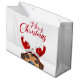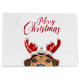 Fotografi av matduk i God jul med en nyfiken hund som bär ett hårband för renar. Säsong Julhälsningar i modern typografi i brev.