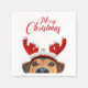 Fotografi av matduk i God jul med en nyfiken hund som bär ett hårband för renar. Säsong Julhälsningar i modern typografi i brev.