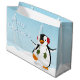 En söt vinterillustration med en klumpig penguin på bra humör med handskar och handdukar som går i snö.