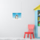En söt vinter-illustration poster: en pingvin med handskar och öronskydd på bra humör går i snö.