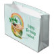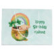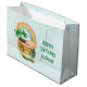 En presentpåse med en vacker illustration med en leende grönt och guld med en söt regnbåge, ett moln från lycklig och lite grönt klöver.