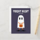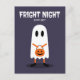 A simple, adorable, and modern Halloween postcard featuring a cute cartoon ghost holding a classic jack-o'-lantern candy bucket. The design has a fun, clean aesthetic with a dark purple background and bold white "FRIGHT NIGHT" text. With the date "31ST OCT," this vertical card is perfect for a friendly Halloween party invitation, a general seasonal greeting, or an announcement for a kids' trick-or-treat event. Its non-scary style appeals to all ages.