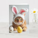 This card features a ginger-striped cat in soft, diffused light, gazing forward with wide green eyes that feel like a friendly hello. A fluffy white bunny-ear headband sits on its head, with pink lining inside the ears for a sweet spring touch 🐰. The background fades into a smooth, pale blur, keeping attention on the cat’s fur markings, whiskers, and the gentle curl of its paws. Near the bottom, a short Easter greeting is placed in small, light gray lettering, centered so it doesn’t distract from the portrait. A second line of text sits just beneath it in a muted pastel tone, spaced neatly and kept understated. In the foreground, two round egg-like shapes rest close together, suggesting a cozy, shared moment like friends leaning in for a photo 🌷. One sphere is creamy white with soft brown speckles, and the other is a warm yellow, both sitting on a lightly lit surface.