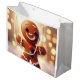 The image presents a festively-decorated gingerbread man, which is the central focus of the frame. The gingerbread man bears a cheerful expression. The body is adorned with white, red, and green embellishments, particularly red and green buttons on the belly. The figure is positioned on a snow-covered layer. The background setting is filled with a display of golden or yellow lights, creating a warm and holiday-like atmosphere. These lights give off a starry or bokeh effect, making the image have a likely blurred aspect. The overall mood of the image is celebratory, possibly related to the winter holiday season.