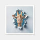 En giraffes huvuduppspelning kommer fram genom biet på t av papper och skapar en 3D-effekt mot en blå bakgrund