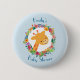 En knappbricka för en babydusch med en illustration av en söt leende giraffe ansikte, omgiven av en krans av tropiska vattenblommor. Färgfull och söt.
