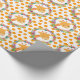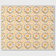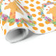 Förpackning papper med en illustration av en söt leende giraffe ansikte, omgiven av en krans av tropiska vattenfärger blommor. Färgfull och söt. Bakgrunden är ett mönster med orangens viskfläckar.