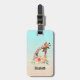 En bagagetagg med söt teckning i vattenfärger i mamma och baby. Mor giraffe vilar på huvudet ovanpå baby giraffe, älskande och förtjusande. Söt rosa, gult, grönt vattenfärgsblomma bouquet placerad under detta älsklingspar. En övertoningsbakgrund skapat med en delikat turkosa blå färg som blandas i ett sandbrunt färg.