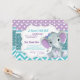 Lila och turkos Grått Elefantinbjudan till babyskor. Inbjudan med Watercolor elephant Cliart med polka- och chevron-bakgrund.