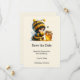 Spara datumkortet med en söt bild. En flicka i en skurkaktig bidräkt med ett bi vid hennes sida. Titta över en burk av honung.