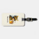 En bagagetagg med en söt bild. En flicka i en skurkaktig bidräkt med ett bi vid hennes sida. Titta över en burk av honung.