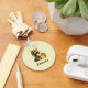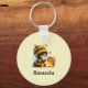 En nyckelkedja med en söt bild. En flicka i en skurkaktig bidräkt med ett bi vid hennes sida. Titta över en burk av honung.