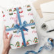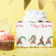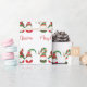 Papper julomslutning med tre söta nordiska gnomer med rött och grönt säsong Skandinaviska stil och manteldjur. "God jul" är skrivet i ett skript med trendiget red.