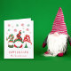 Kortet Cute personlig med vikt helgdag med tre skandinaviska-stil-gnomer med röd säsong och rödhatt och manteln med röd tråd, grönt och guld snöflingor. Anpassa "God jul" hälsning (t.ex. "Glad helg") i roligt röd typografi och ditt namn vid grund. Lägg till ett meddelande inuti eller lämna tomt.
